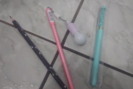 | Canetas e lápis que vieram na edição. Essa com cristais se tornou minha favorita. Ela é da cor do blog '-' Essa com lâmpada realmente acende. O lápis lindinho de unicórnio foi surupiado pela minha querida irmã |