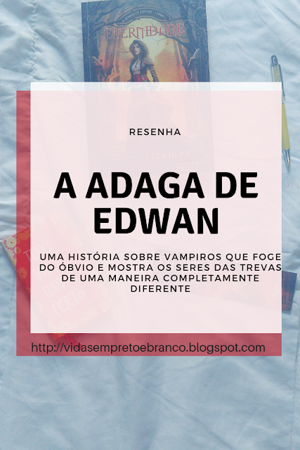 Taylor Harper só queria ser normal, mas ela era uma Vampira Branca, com o poder sobre o elemento fogo, herdeira de uma Profecia e a única capaz de matar o Vampiro das Sombras, o mais poderoso vampiro que já andou sobre a terra. Desde que abrira os olhos pela primeira vez, Taylor soube que sua vida não seria nada fácil. Nascida em meio a uma guerra na qual os vampiros de sua espécie eram forçados a fugir e se esconder, esquecendo até mesmo como usar a sua magia interior como arma, Taylor acaba se vendo dividida entre salvar aqueles que ama e salvar o mundo inteiro. O destino de todos está nas mãos de Taylor.E, finalmente, a resenha de um livro físico aqui. Eu disse pra vocês que estou adotando os e-books pra minha vida. Enfim, hoje vamos falar sobre o livro um da serie A adaga de Edwan - Eternidade.